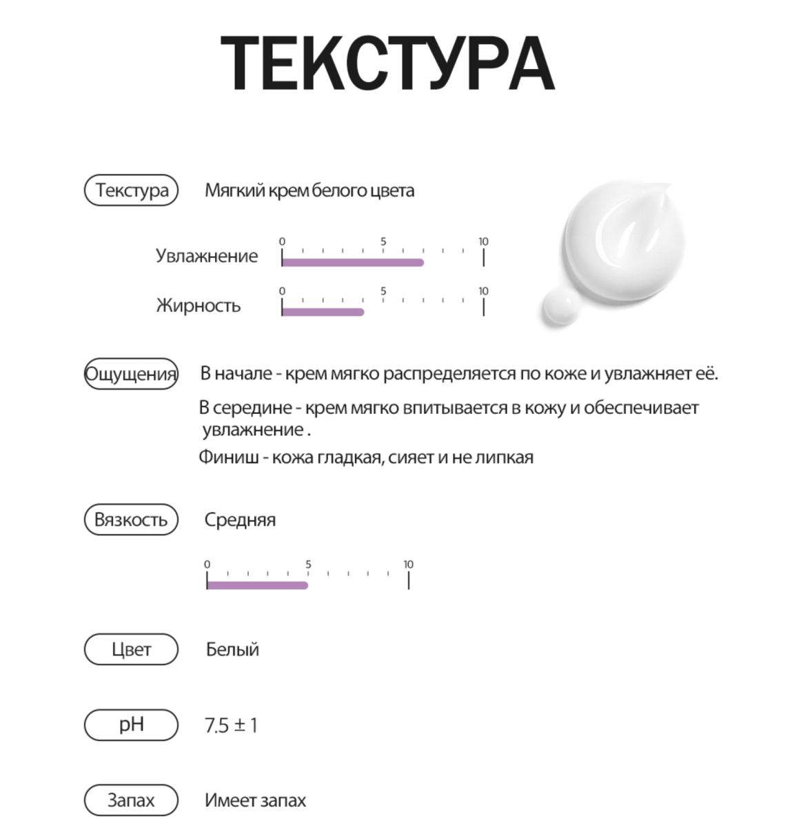 В состав крема входят: масло карите (ши), ниацинамид, трегалоза, растительный глицерин, аллантоин, аденозин, глюкоза и др.