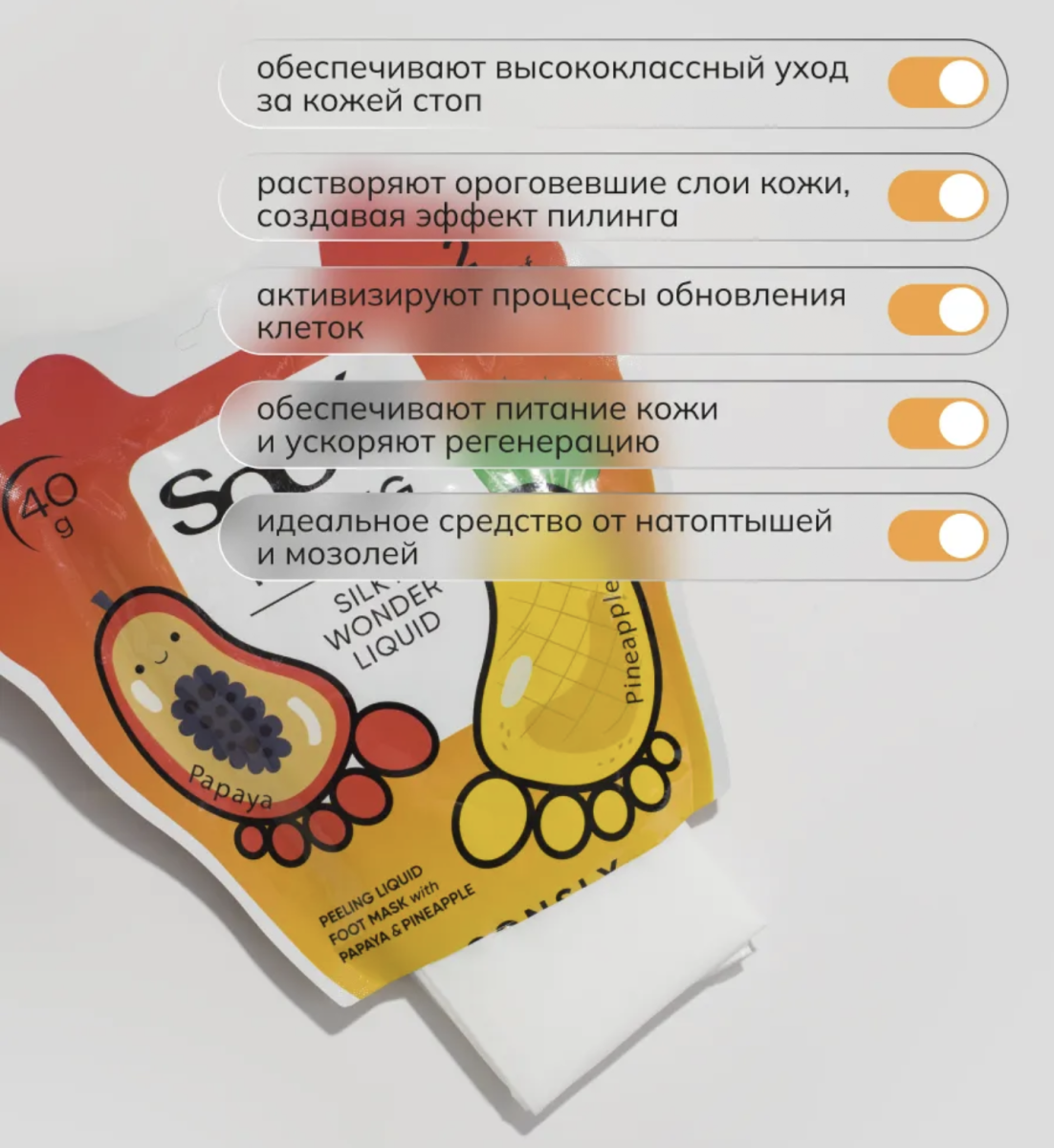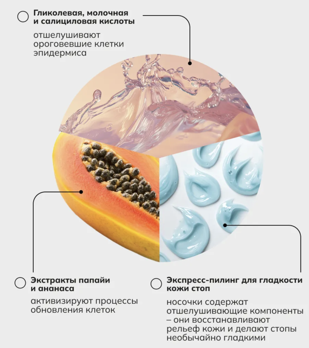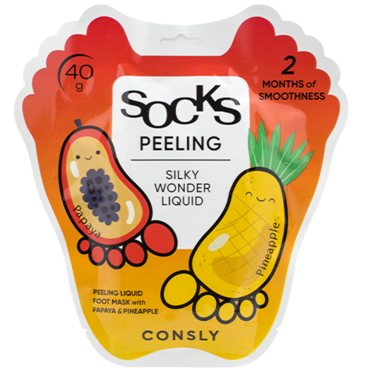 Consly — это экспресс-средство для педикюра в домашних условиях. Специальный пилинг-раствор, налитый в носочки, при контакте с кожей, растворяет ее ороговевшие слои, создавая эффект пилинга, и предназначен для отшелушивания старой огрубевшей кожи, в том числе в труднодоступных местах, в складках и на пальцах ног. Экстракты папайи и ананаса в комплексе с мочевиной активизируют процессы обновления клеток, обеспечивают питание кожи, ускоряют регенерацию. Гликолевая, молочная и салициловая кислоты отшелушивают омертвевшие клетки эпидермиса, увлажняют и восстанавливают кожу, делают её гладкой, мягкой и нежной, как у младенца. С этим средством вы забудете о боли и усталости в ногах. Регулярное использование таких носочков обеспечивает необыкновенно гладкие пятки, избавляет от мозолей, грубой кутикулы, натоптышей и шероховатостей на долгое время.