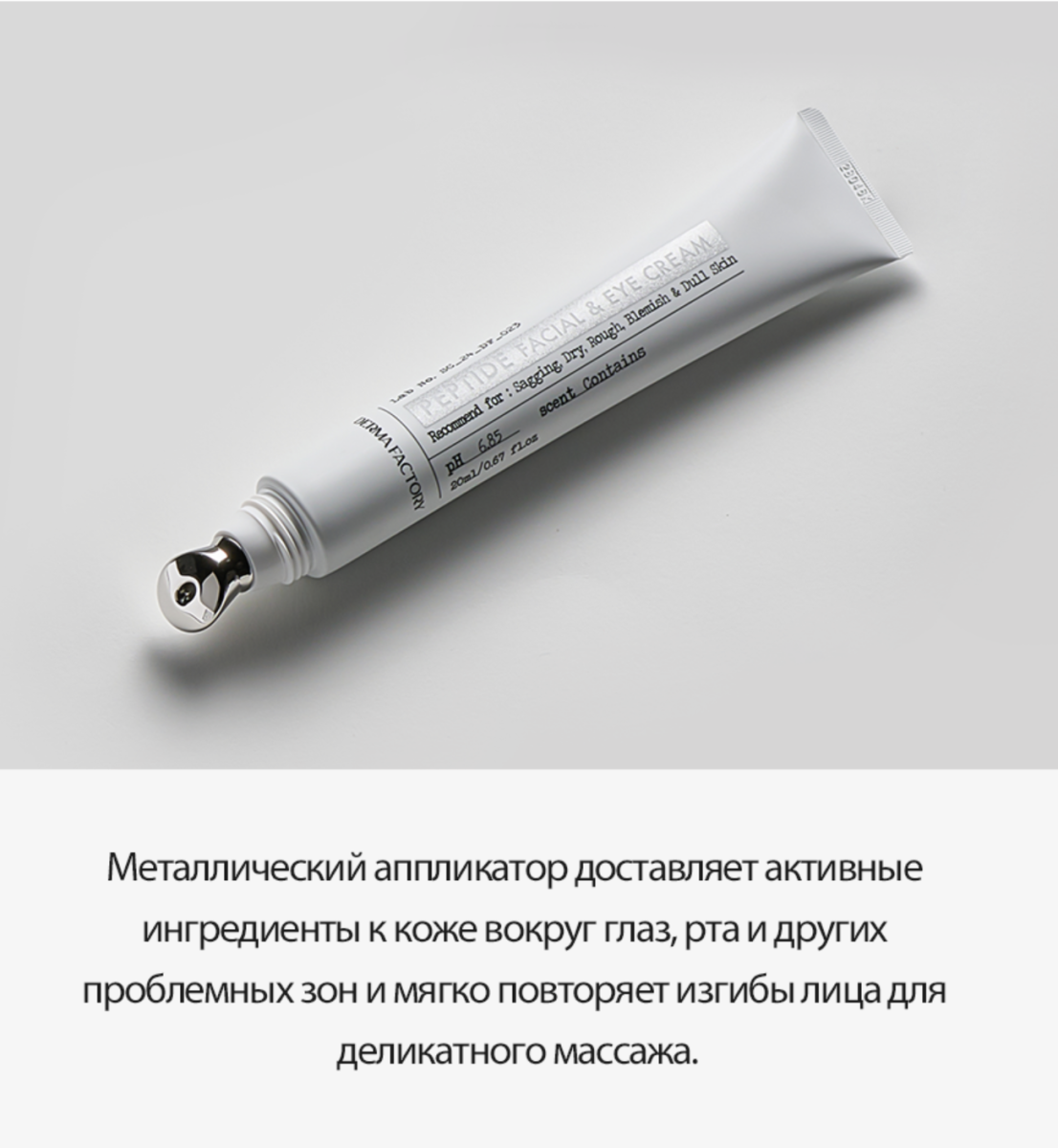 Derma Factory содержит 1000ppm пептидов, 1% комплекса Секольджи (церамиды+жирные кислоты+холестерин) в липосоме и 51.6% коллагеновой воды деликатно устраняет морщины вокруг глаз с помощью металлического аппликатора и укрепляет кожу всего лица. Пептиды восстанавливают метаболизм в клетках и поддерживают его на оптимальном уровне.