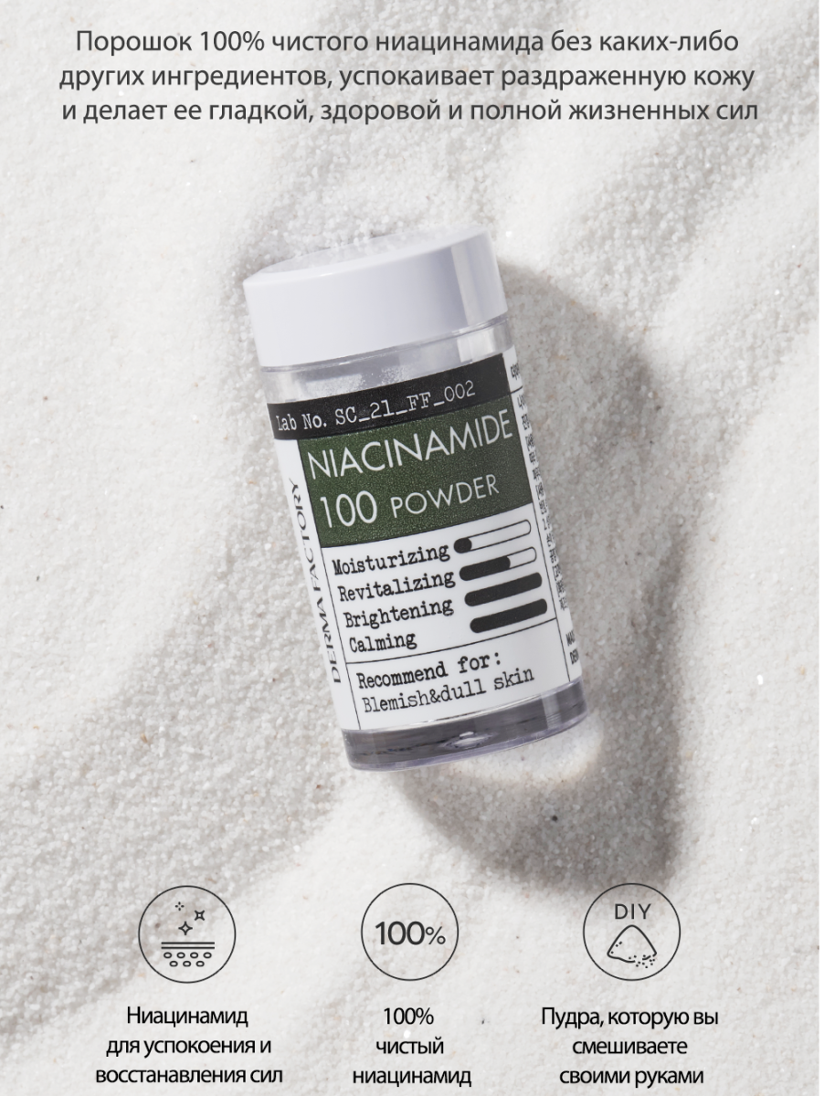Derma Factory решает проблемы вашей кожи, успокаивает раздраженную кожу, делая ее шелковистой, здоровой. Высокоэффективный и функциональный порошок с нежной текстурой, который можно смешивать с уходовым средством, регулируя объем по своему желанию в зависимости от состояния кожи. Высокоэффективный и функциональный порошок с нежной текстурой, который можно смешивать с тонером, сывороткой или кремом, регулируя объем по своему желанию в зависимости от состояния кожи. Ниацинамид используется при борьбе с розацея и угревой сыпью, также ниацинамид считается полезным компонентом по уходу за любым типом кожи. Ингредиент способен за короткий промежуток восстановить барьерную функцию кожу, он сочетается с многими компонентами, которые раздражают кожу. Например, поможет успокоить и уменьшить воспаления, которые возникают при переходе на ретинол/ретиноиды. Ниацинамид устойчив и к жаре, и к холоду. Не повышает фоточувствительность кожи. Ниацинамид хорошо подходит для проблемной или чувсвительной кожи, регулирует выработку себума, борется с высыпаниями, вызванными жирностью, значительно сужает поры, а также влияет на некоторые штаммы бактерий, которые вызывают кожные инфекции.