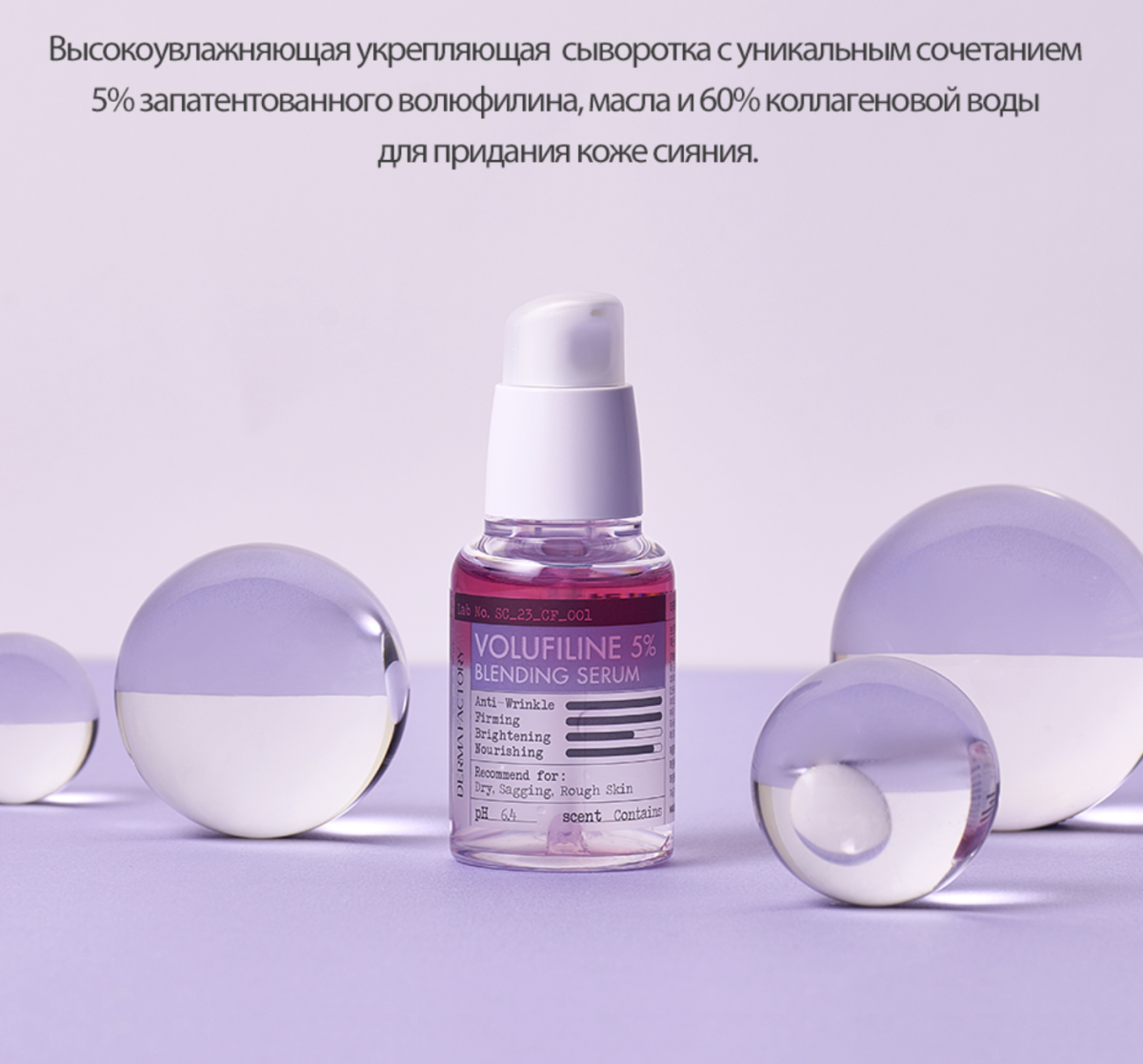 Антивозрастная формула Derma Factory Volufiline 5% Blending Serum — двухфазная сыворотка для лица с волюфилином. Микс из коллагеновой воды и масла восстанавливает дряблый, истощенный эпидермис. Продукт глубоко питает, укрепляет структуру кожи, делает ее плотной, эластичность. Возвращает равномерный тон, разглаживает дефекты рельефа. За 45 дней средство создает новый липидный слой, наполняя кожу утраченным объемом из-за возрастных изменений.