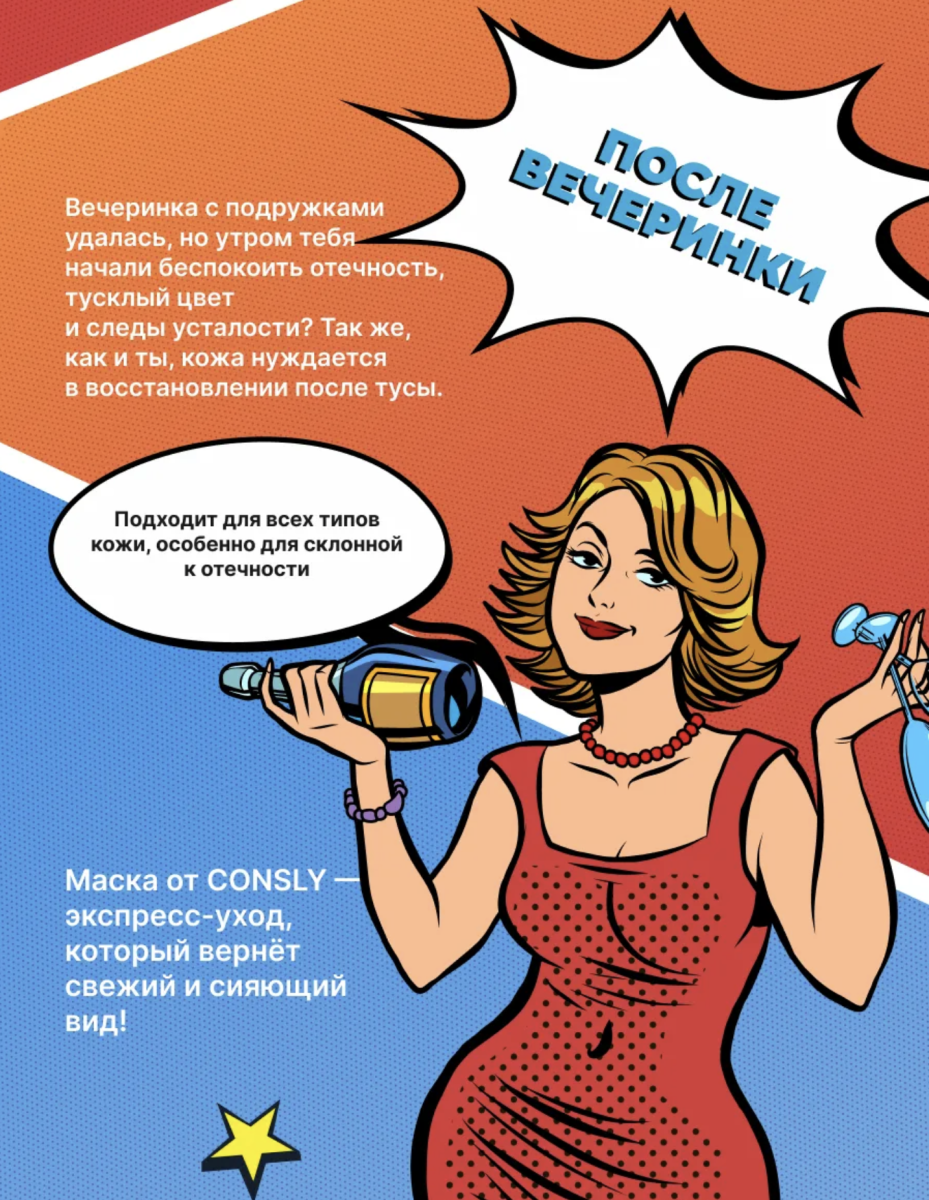 Consly оказывает интенсивное увлажняющее действие на кожу, испытывающую острую нехватку влаги, тонизирует, снимает отечность, делает лицо отдохнувшим и свежим. Экстракт бамбука способствует выработке коллагена, повышая эластичность кожи, подтягивая ее и улучшая тонус. 4 вида гиалуроновой кислоты оказывают превосходное увлажнение, восстанавливают поврежденную кожу, улучшают эластичность и делают ее гладкой. После использования маски кожа становится более упругой, свежей, подтянутой. Для всех типов кожи, особенно для обезвоженной, склонной к отечности и поврежденной.