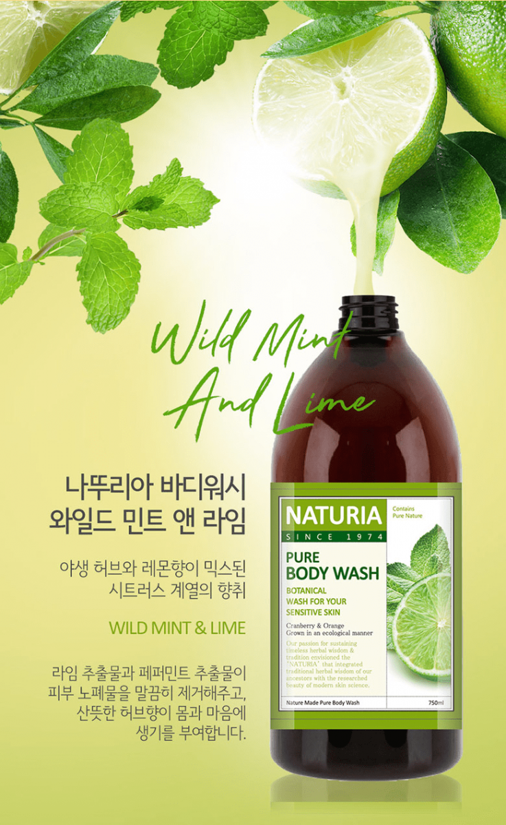 Купить Naturia Гель для душа с мятой и лаймом 750 мл Pure body wash wild mint & lime в интернет-магазине корейской косметики UNBOXSHOP