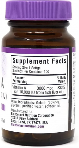 Ценнейшая добавка - чистый витамин А от известного американского бренда Bluebonnet Nutrition в высокой концентрации, составляющей 333% от суточной нормы. Усиленный курс данной добавки помогает значительно повысить иммунитет, улучшить зрение и состояние глаз, укрепить кожу и улучшить общее состояние организма. Дефицит витамина А в организме может вызвать сухость кожи или экзему, угревую сыпь, различные нарушения репродуктивной функции, сухость глаз, "куриную слепоту" (значительное ухудшение зрения в темноте). Исследования доказывают, что употребление ретинола (витамина А) в виде дополнительной добавки к пище помогает адаптировать зрение к темноте, улучшить цветопередачу (восприятие яркости цветов), снизить риск возрастной потери зрения, стимулировать активную выработку коллагена (укрепить кожу, волосы, кости, суставы и связки), уменьшить воспаления на коже и экзему, значительно повысить иммунитет и усилить устойчивость к болезням. В добавке от Bluebonnet содержится только высококачественный морской витамин А, добытый из печени глубоководных и холодноводных рыб методом молекулярной дистилляции (считается одним из наиболее ценных видов).